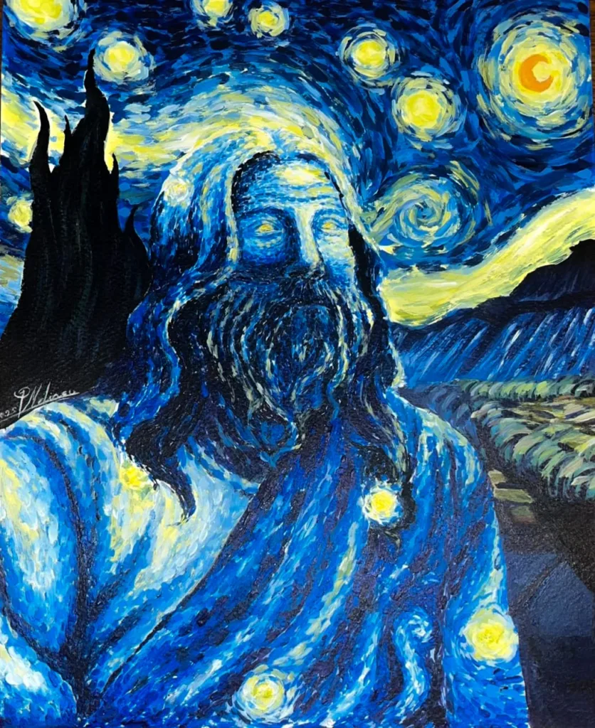 La mezcla de una pintura conocida por muchos, la noche estrellada de Van Gogh, y de Jesucristo. La presencia de Él siempre está allí, iluminando cada estrella de la noche. El alma apagada que esté dispuesta a ver, se encenderá.