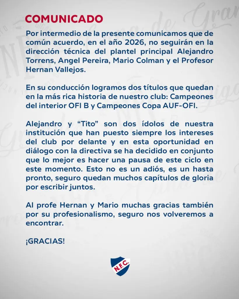 El sábado 10 de enero, se abrocha a la historia de las decisiones que no pasan de largo en el caso de Nacional Fútbol Club, desde el momento que a través de un comunicado, la Comisión Directiva resolvió dar por finalizado el ciclo de quienes ostentaban la conducción del plantel superior en sus diferentes roles: Héctor Alejandro Torrens, Ángel Pereira, Mario Colman y el Profesor Hernán Vallejo. En Nacional suscriben que «no es un adiós, es un hasta pronto y seguro quedan muchos capítulos de gloria para escribir juntos».