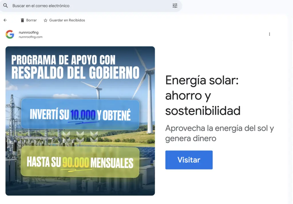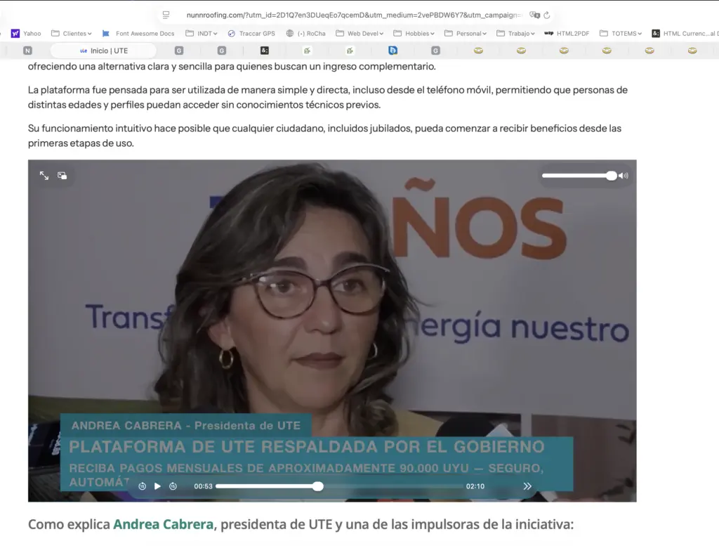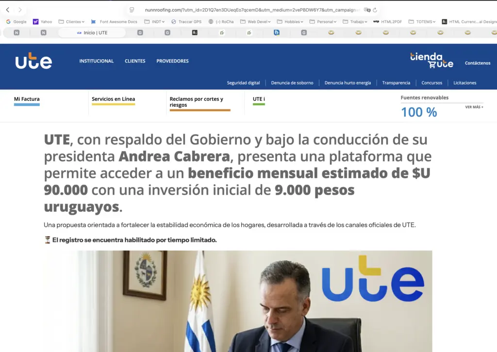 Si hace click en el botón «Visitar» lo llevará a una página diseñada para engañarlo que está visitando el portal de UTE, con una imágen del presidente Orsi y hasta un video armado con AI que tiene a la Presidente de UTE, Andrea Cabrera explicando cómo es que funciona este sistema y la oportunidad que representa.