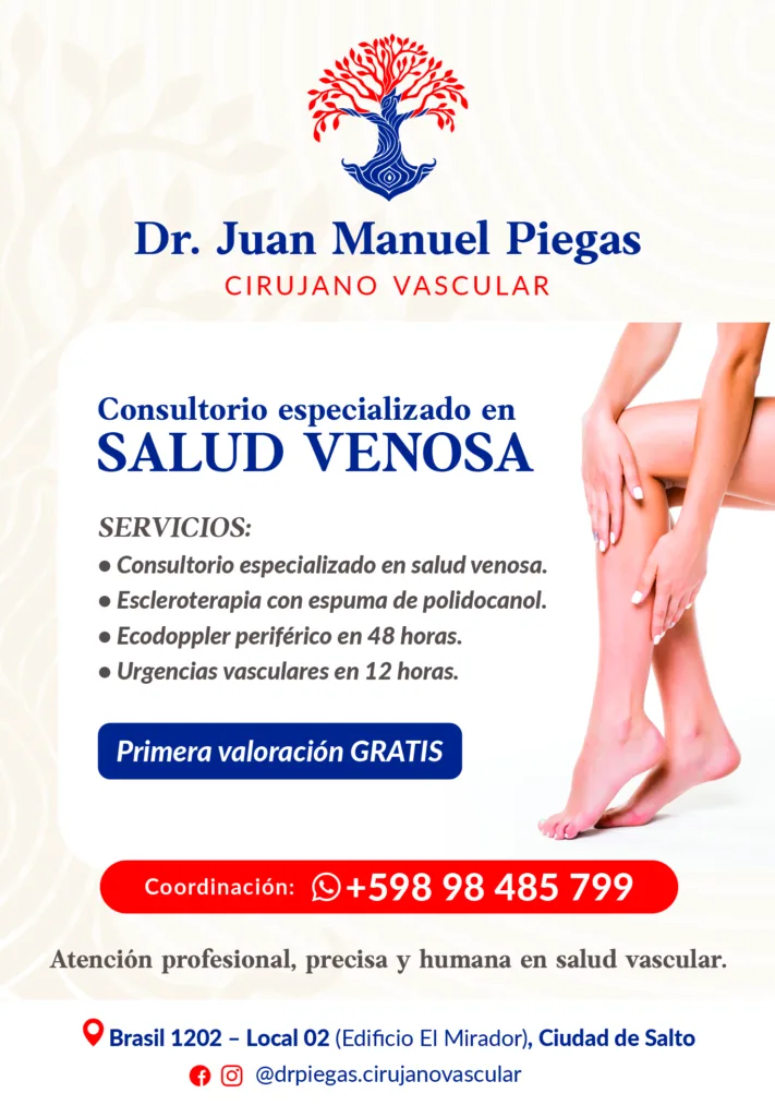 La instalación del consultorio del Dr. Juan Manuel Piegas en la Ciudad de Salto representa un fortalecimiento directo de la oferta médica especializada del departamento. Su incorporación permite acortar tiempos de diagnóstico, ofrecer tratamientos modernos sin necesidad de traslados y mejorar la calidad de atención en una especialidad clave como la salud vascular.