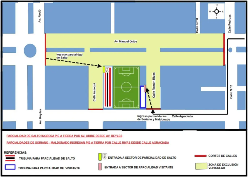 Para facilitar el acceso y despeje del estadio, la Policía y la Liga Salteña establecieron cortes en las siguientes intersecciones: