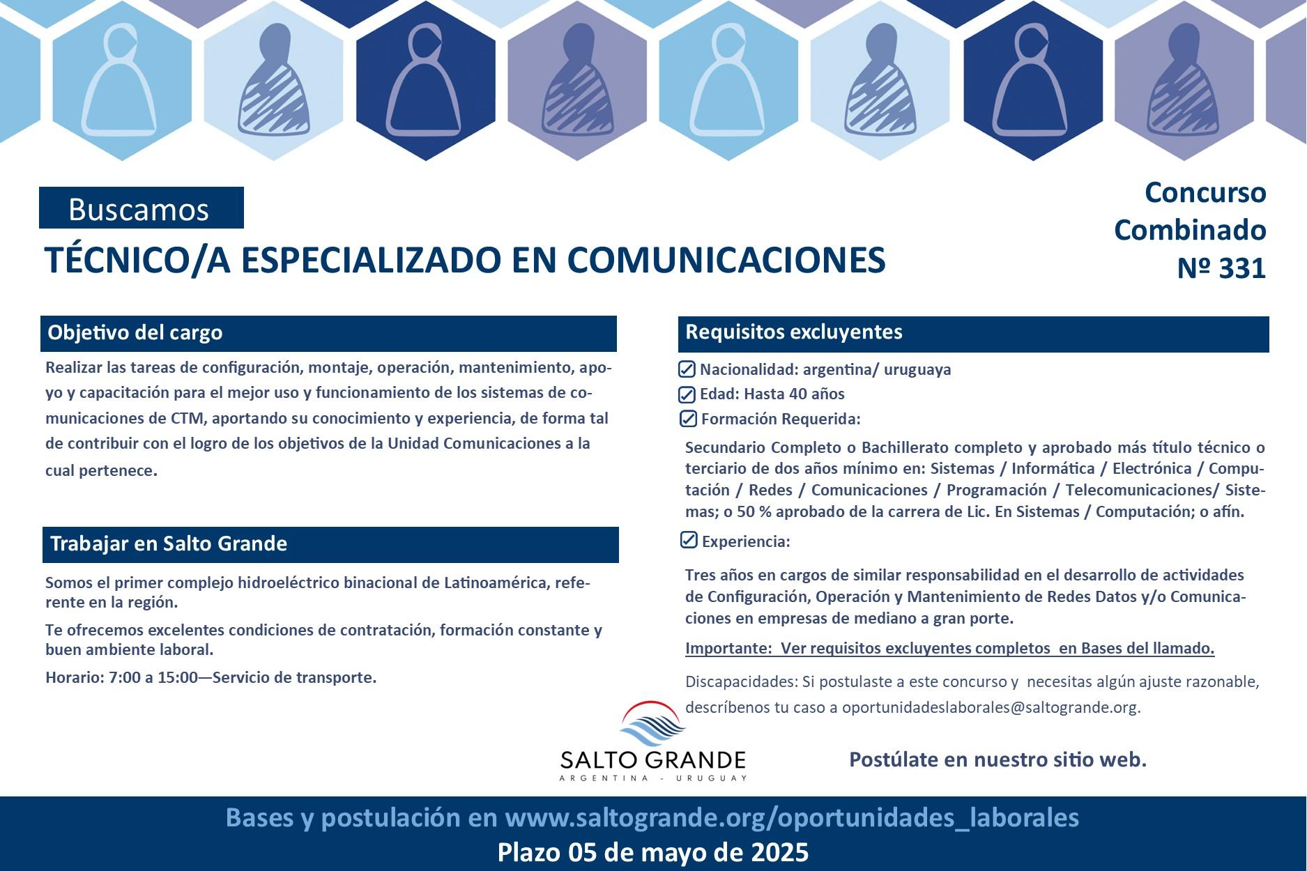 La Comisión Técnica Mixta de Salto Grande lanzó el Concurso Combinado Nº 331 para incorporar a su equipo un/a Técnico/a Especializado/a en Comunicaciones. Esta convocatoria está dirigida a personas de nacionalidad argentina o uruguaya, con una edad máxima de 40 años, que cuenten con formación técnica y experiencia en áreas vinculadas a redes, sistemas o telecomunicaciones.