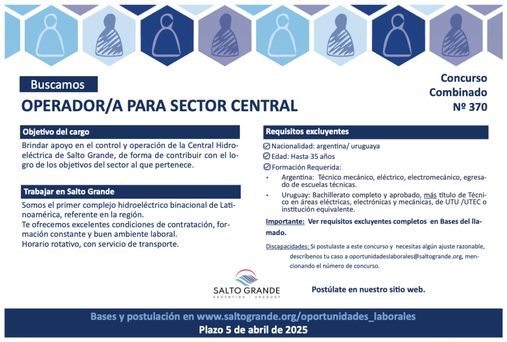 La Central Hidroeléctrica de Salto Grande abrió un llamado a concurso para cubrir el cargo de Operador/a para el Sector Central.