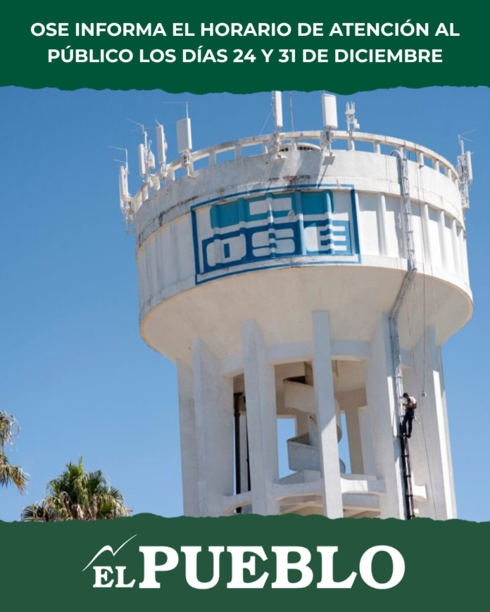 La Obras Sanitarias del Estado (OSE) informó que los días 24 y 31 de diciembre atenderá al público en el horario especial de 09:30 a 12:00, en todas las oficinas del país.