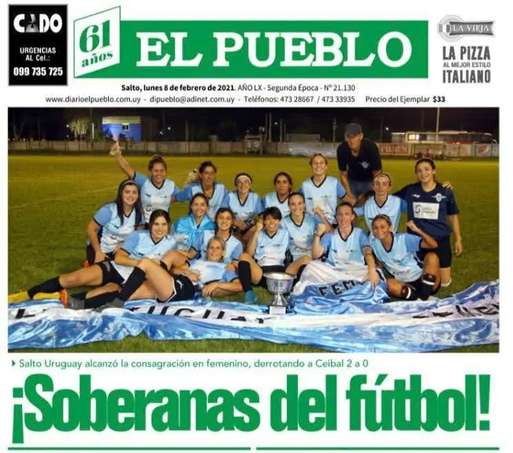 Gracias a una prima que un día me cae un mensaje. Yo tenía 24 años, mis hijos estaban un poquito más grandes. Romi me dice: estoy vendiendo milanesas para colaborar con el fútbol femenino de Salto Uruguay, y yo digo: ¿fútbol femenino, Romi, hay? Me dice: sí, hay una liga donde hay como nueve equipos, con árbitros, organizada, formal. Yo no podía creer porque el último recuerdo que tenía a los 16 años era ese rejunte que Ramón hacía, y de golpe a los 24 se me dio vuelta todo en ese momento y no podía creer. Digo: bueno, decime cuándo entrenan que voy a empezar. Y el papá de mis hijos siempre me apoyó, sabía lo que yo amaba el fútbol, siempre mirábamos con él. Empecé en Salto Uruguay y en el 2020 fuimos el único cuadro, tengo el orgullo de decirlo, que destituyó la invicta a Ceibal en el campeonato salteño. Hasta ahora, hasta el 2026, Ceibal sigue ganando todos los años, solamente en el 2020 Salto Uruguay ganó y formé parte de ese equipo, que fue un recuerdo hermoso. Tengo la publicación del diario El Pueblo siempre, en cada febrero lo publico como recuerdo. Esa fue la primera alegría que me dio el fútbol, una alegría enorme, un sueño ya hecho realidad. Levantar una copa para una futbolista ya es algo increíble».
