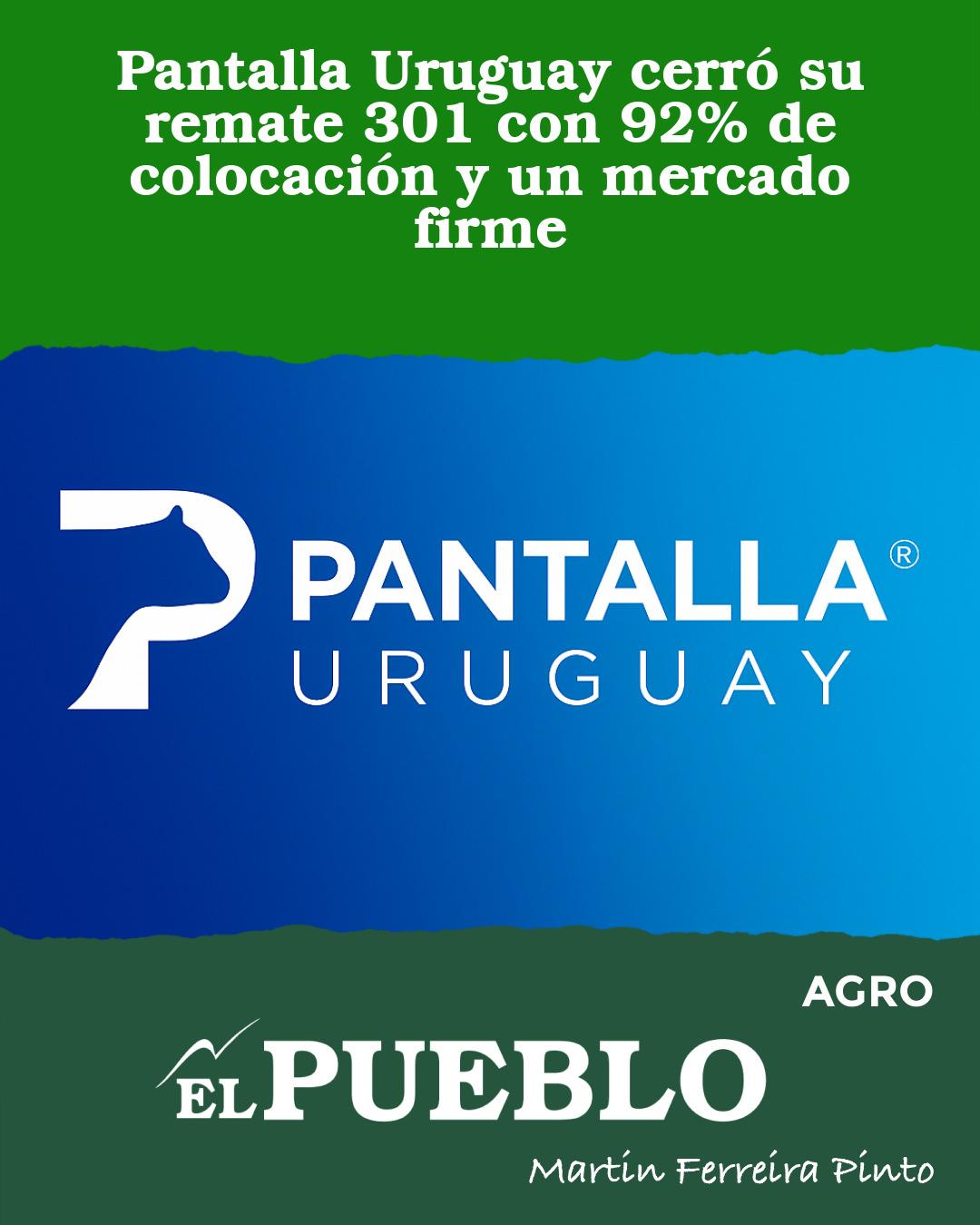 Durante el jueves y viernes pasados se desarrolló el remate 301 de Pantalla Uruguay, con una oferta total de 13.800 vacunos y 490 lanares, alcanzando una colocación del 92%, lo que equivale a 12.604 animales vendidos.