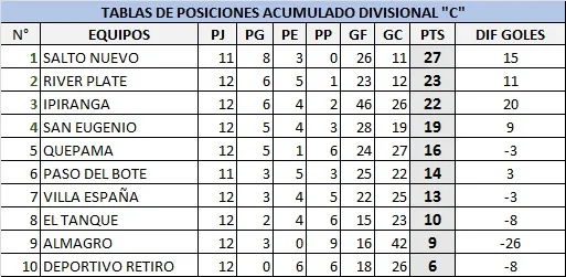 Por ahora, la punta está a manos de Salto Nuevo, con 27 puntos alcanzados y la condición de invicto, siendo el equipo menos batido.