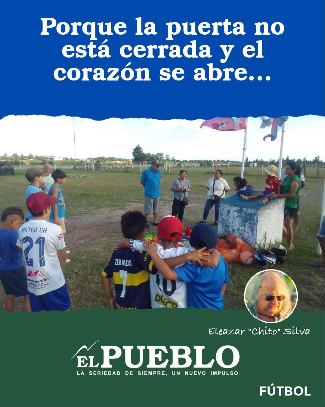 El “Cacho” no está solo en la misión. Tiene colaboradores. Cuando va cayendo la tarde, los gurises van llegando. No les falta una botellita de agua y las pelotas invitan al “picado”.