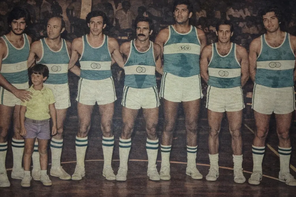 No hay caso, con las décadas de los 70 y 80 a nivel del básquetbol capitalino. Porque además en esas décadas también, resonaban los campeonatos nacionales, y a Salto no le faltaron consagraciones, tanto a nivel del Interior como Nacional. Los inolvidables dictados de la roja de la «S».Pero es concreto que también que equipos de Montevideo solían sumar a jugadores salteños. Este caso de SPORTING es concreto. Aparecen de izquierda a derecha: CARLOS CHAIBUN, Atilio Caneiro, Marcos Arias, Carlos Peinado, EDGARDO IRRAZÁBAL, Roberto Bomio y Leonardo Tijero. En el caso de Chaibun, se modeló desde la niñez y la adolescencia en Círculo Sportivo, mientras «Pancho» Irrazábal nació basquetbolisticamente en Peñarol. En los años 80 retornó por un tiempo a Salto para defender al ya extinguido Atlético Estudiantil Osimani y Llerena. Ese Sporting, además los dos salteños, lució a dos cerebrales del básquetbol, como Peinado y Caneiro, entre otros, de los que defendieron a Montevideo en los campeonatos nacionales de la década. Otro tiempo. Otra defensa de los jugadores del medio, hasta que se abrían las puertas para los foráneos. Otra historia se planteaba. Pero aquella, resultó inolvidable. Con Sporting incluído, el de los salteños.