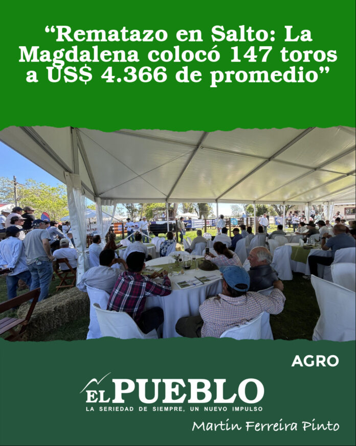 Con una pista colmada y un clima de entusiasmo general, La Magdalena de Los Tordos S.A. celebró su 22° remate anual en el local de la Asociación Fomento Rural de Valentín, en Salto, logrando ventas totales de 147 toros a un promedio general de US$ 4.366.