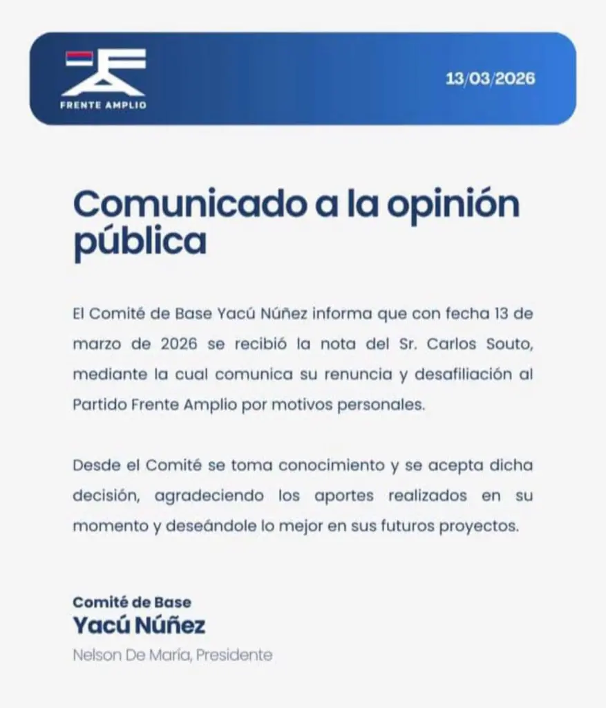 El Comité de Base Yacú Núñez informó oficialmente que el pasado 13 de marzo de 2026 recibió la nota de renuncia y desafiliación de Souto, quien argumentó motivos personales para tomar la decisión. Desde el sector, se aceptó la dimisión y se agradecieron los aportes realizados durante su trayectoria política.