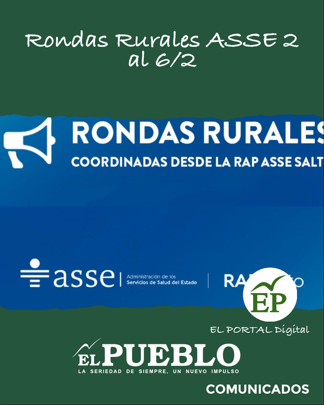 La Red de Atención Primaria de Salto de ASSE informó el cronograma de Rondas Rurales correspondiente a la semana del lunes 2 al viernes 6 de febrero de 2026, manteniendo la atención sanitaria en diferentes puntos del interior del departamento.