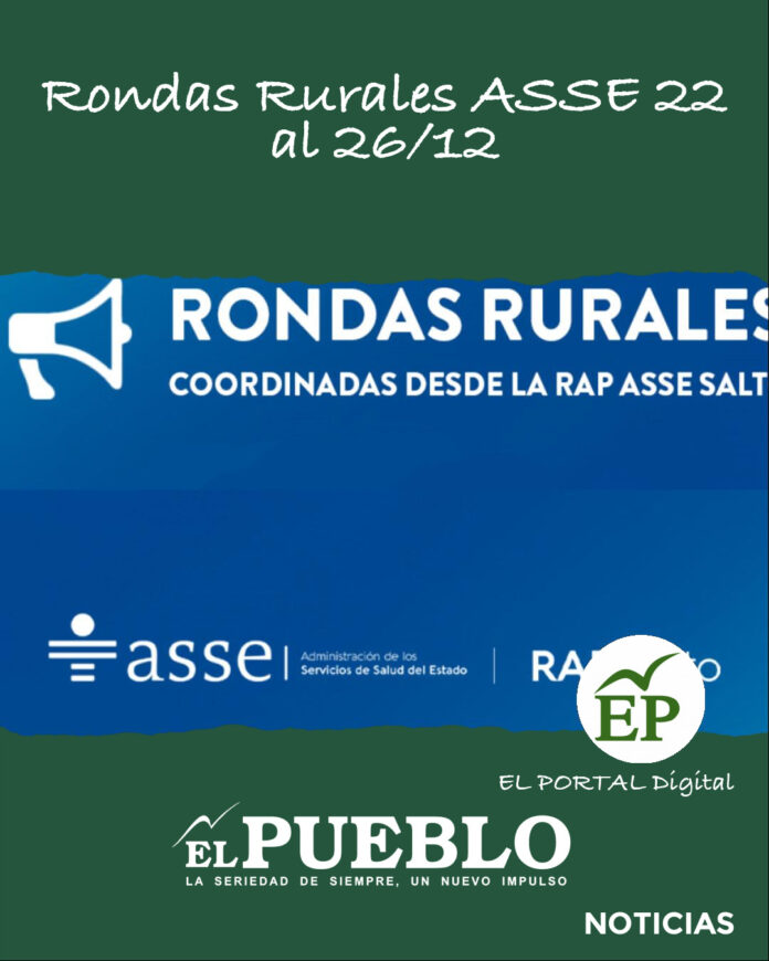 La Red de Atención Primaria Salto de ASSE dio a conocer la agenda de Giras Rurales correspondiente a la semana del lunes 22 al viernes 26 de diciembre de 2025, con presencia de distintos equipos de salud en el interior del departamento y un ajuste especial por el feriado no laborable del 25 de diciembre.
