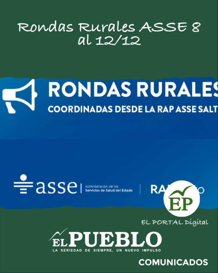 La Red de Atención Primaria Salto de ASSE anunció el cronograma de Giras Rurales correspondiente a la semana del lunes 8 al viernes 12 de diciembre de 2025, asegurando presencia sanitaria en múltiples localidades del interior del departamento.