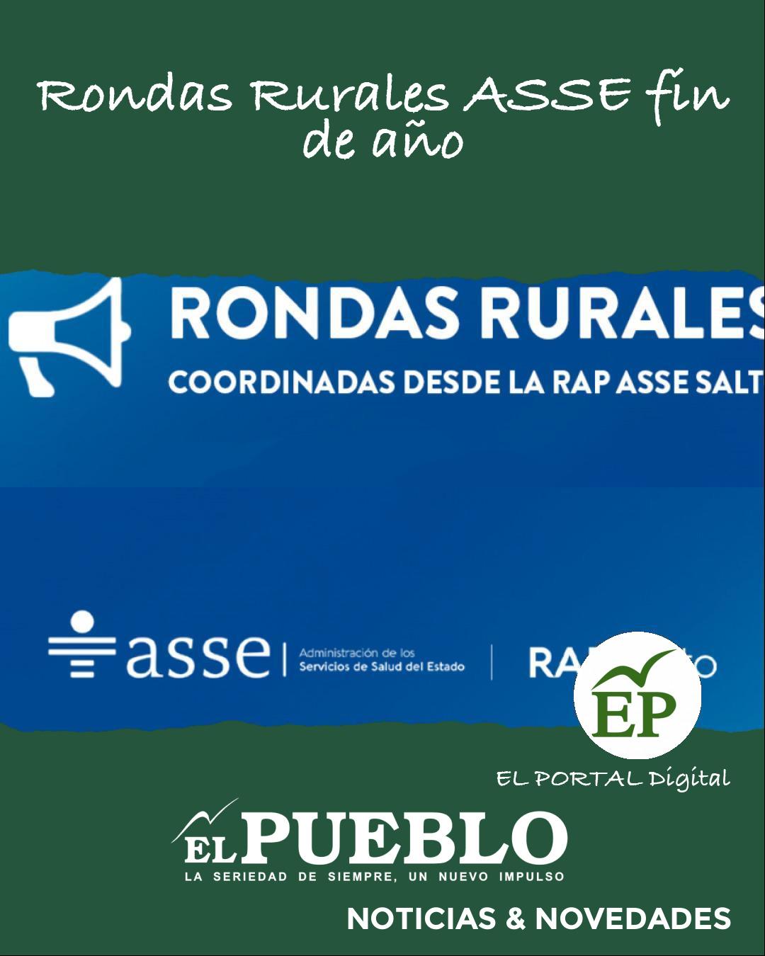 La Red de Atención Primaria Salto de ASSE dio a conocer el cronograma de Giras Rurales correspondiente a la semana comprendida entre el lunes 29 de diciembre de 2025 y el viernes 2 de enero de 2026, período en el que se mantendrá la atención médica en varias zonas del interior, con algunas adecuaciones por licencias reglamentarias y el feriado del 1º de enero.