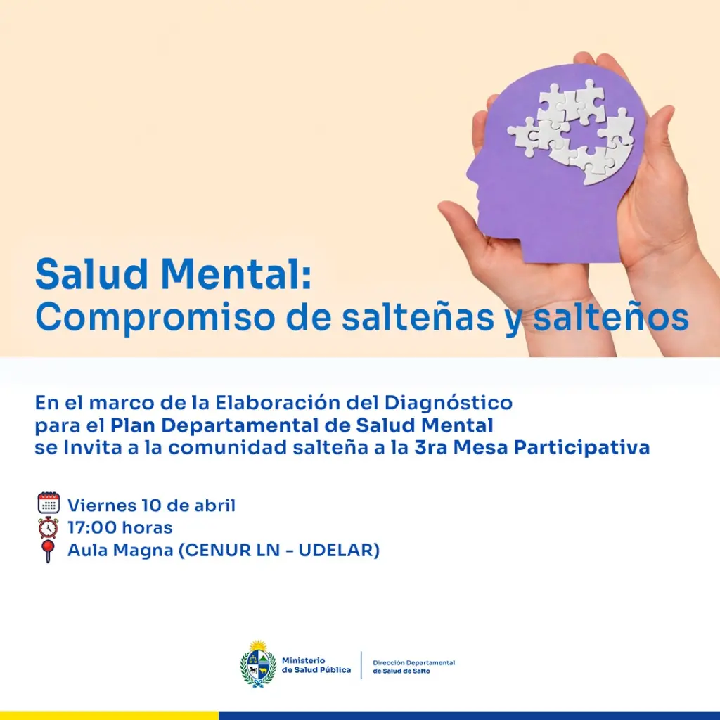 La tercera mesa de trabajo en el marco de la elaboración del diagnóstico para el Plan Departamental de Salud Mental se llevará a cabo el viernes 10 de abril, a las 17:00 horas, en el Aula Magna de la Universidad de la República, bajo modalidad presencial.