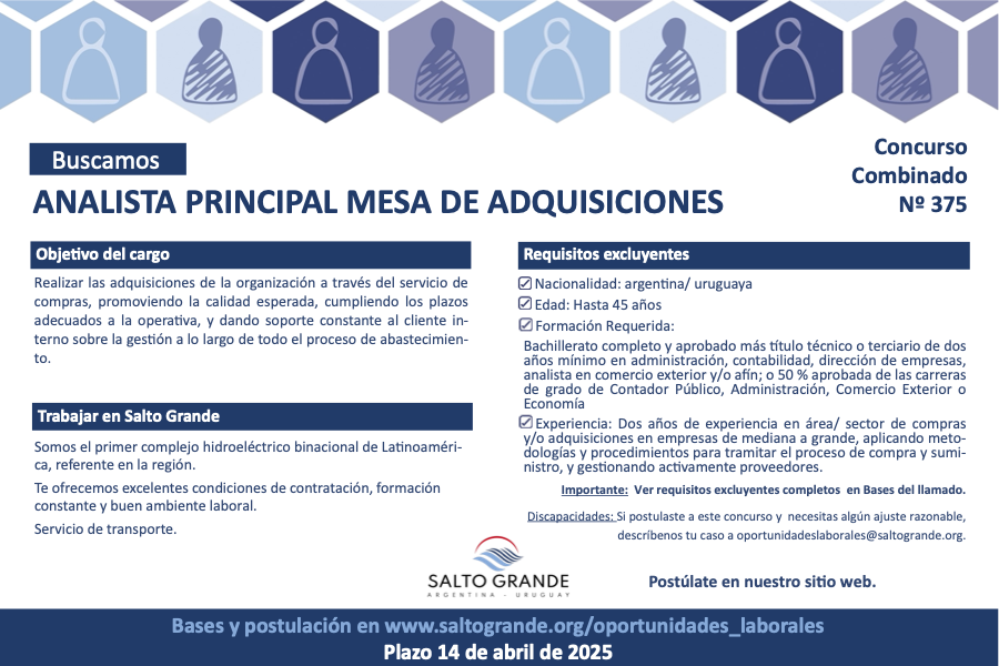 Salto Grande ha abierto un llamado a concurso combinado para el cargo de Analista Principal Mesa de Adquisiciones (N° 375), ofreciendo una oportunidad laboral con excelentes condiciones de contratación, formación constante y un buen ambiente de trabajo.