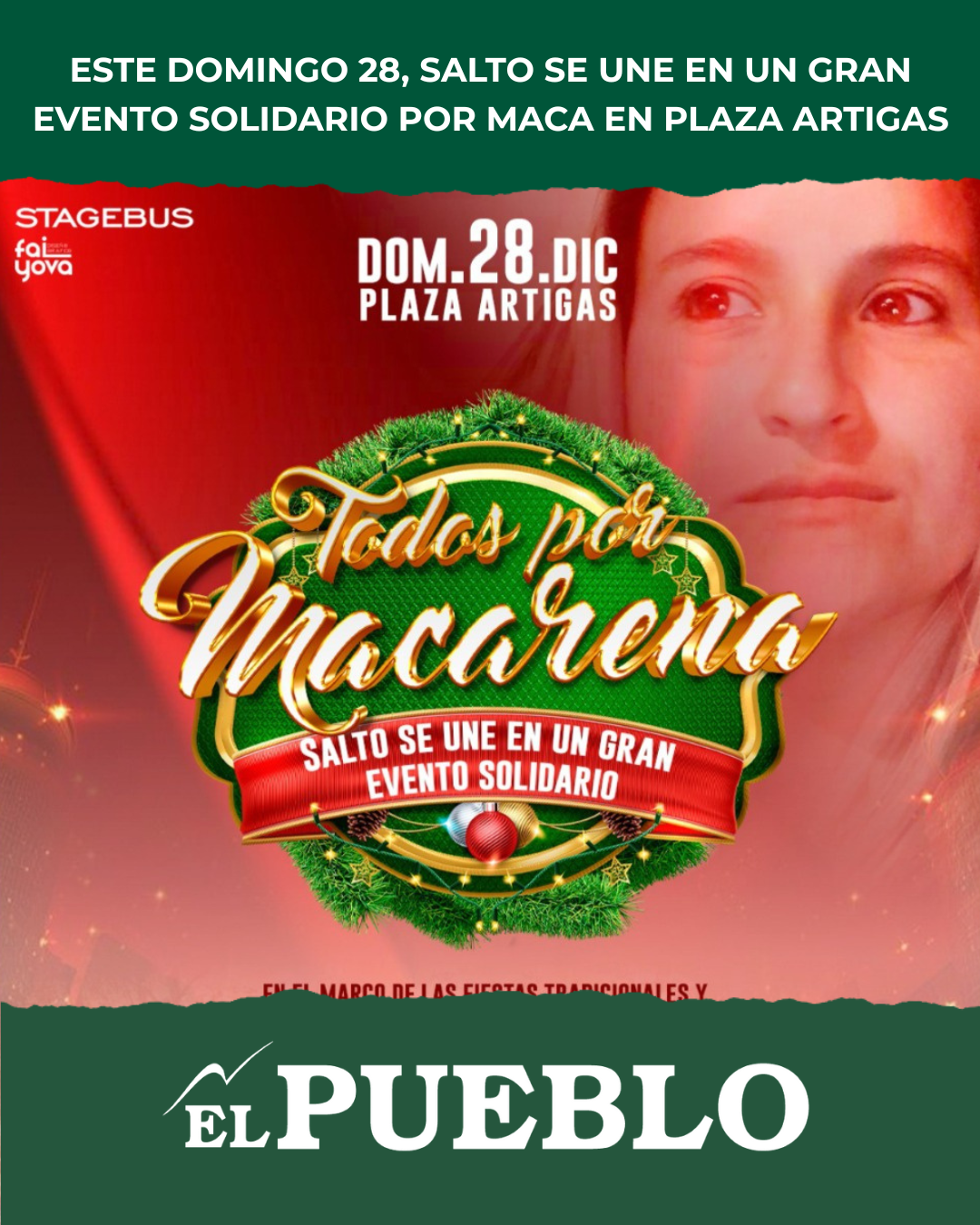 Este domingo 28 de diciembre, desde la hora 19, Plaza Artigas será escenario de un gran evento solidario que convoca a la comunidad salteña a unirse por una causa urgente y profundamente humana: colaborar con Macarena, una joven mamá de dos niños que necesita reunir 6.000 dólares para viajar a Brasil y someterse a una intervención quirúrgica clave para su salud.