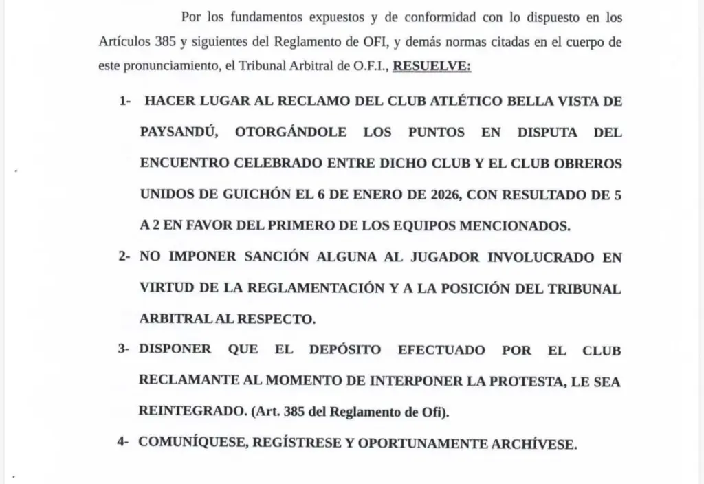 Fue el mano a mano de Bella Vista de Paysandú y Obreros Unidos de Guichón, partido para determinar quién de los dos avanzaba a la Divisional «A» del Campeonato de OFI a nivel de Clubes. Empate en el primer juego y victoria de Obreros Unidos 2 a 0. El hecho es que Bella Vista reclamó los puntos por un jugador que alistó en condiciones antirreglamentarias, desde el momento que el pase en préstamo finalizó el 31 de diciembre y jugó en el partido disputado el 6 de enero. El Tribunal le concedió en estos términos, la razón a Bella Vista que definitivamente será uno más en la «A» y Obreros Unidos a la «B».