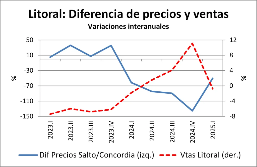 Sin embargo, este proceso se fue agotando con el paso del tiempo. Entre marzo de 2024 y marzo de 2025 la diferencia de precios entre Uruguay y Argentina se redujo de forma mucho más moderada, en un 26%, y partiendo de guarismos bastante inferiores a los antes mencionados. Por tanto, el comercio y los servicios del litoral dejaron de recibir ese shock positivo que representaba el retorno de consumo antes realizado en el vecino país.