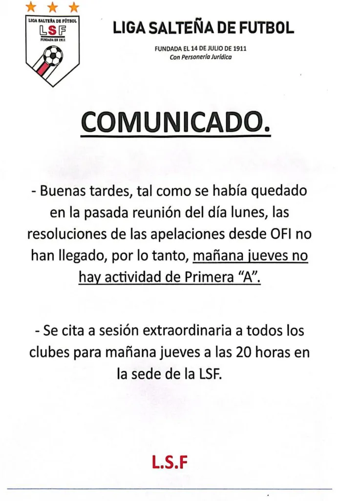 Hay que tener en cuenta que se podrían modificar las series (pares e impares) y, como consecuencia de ello, alterar los partidos. En la tarde de la víspera, desde la Liga Salteña de Fútbol, se procedía a divulgar el siguiente comunicado, como para tener en cuenta el texto.