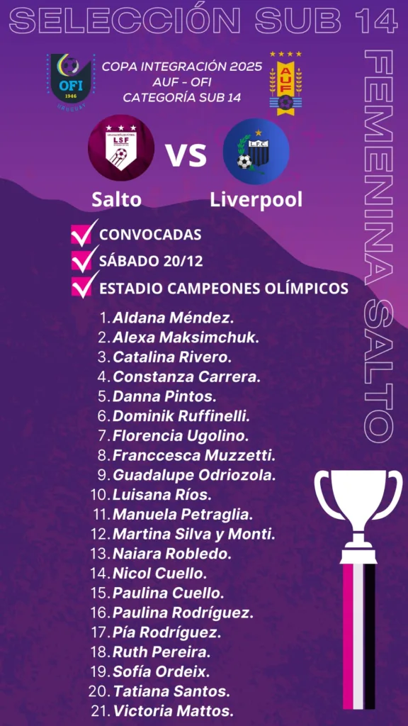 La selección salteña de categoría Sub 14 en femenino viajará esta tarde, algunos minutos después de las 15 horas, desde el Parque Dickinson, para llegar a Florida y, en un hotel, aguardar el partido del sábado ante Liverpool.