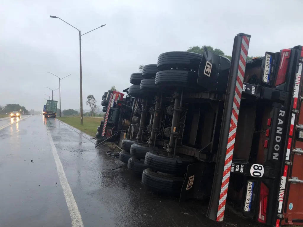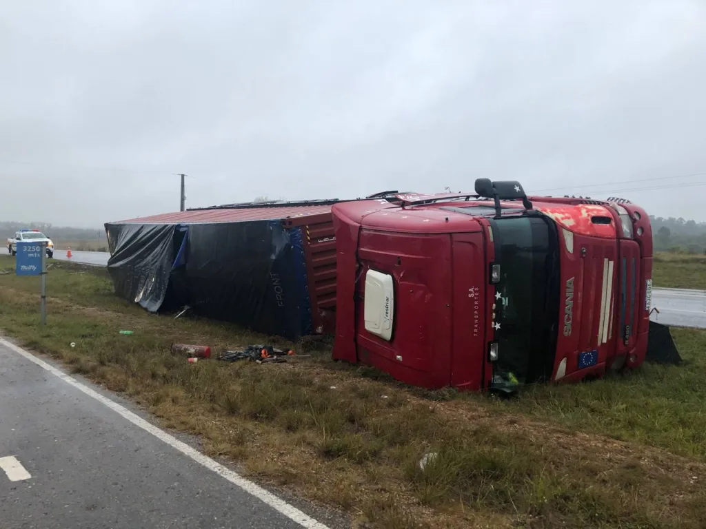 El camión venía desde Montevideo e viaja con destino Paraguay cuando el chofer, intentando controlar el vehículo choca una de las columnas de iluminación y termina volcando.