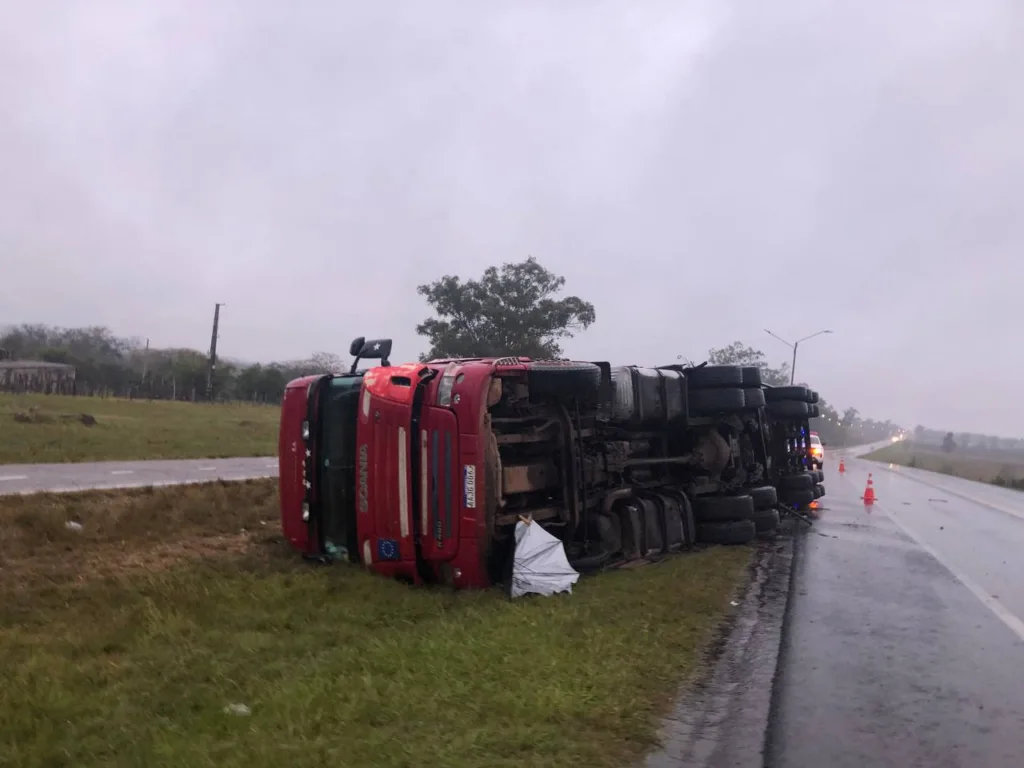 Alrededor de las siete de la mañana, un camión de origen paraguayo sufrió un vuelco luego que, según relató el chofer y único ocupante del vehículo, una de las cubiertas del tractor reventara y lo «sacara» de la ruta.