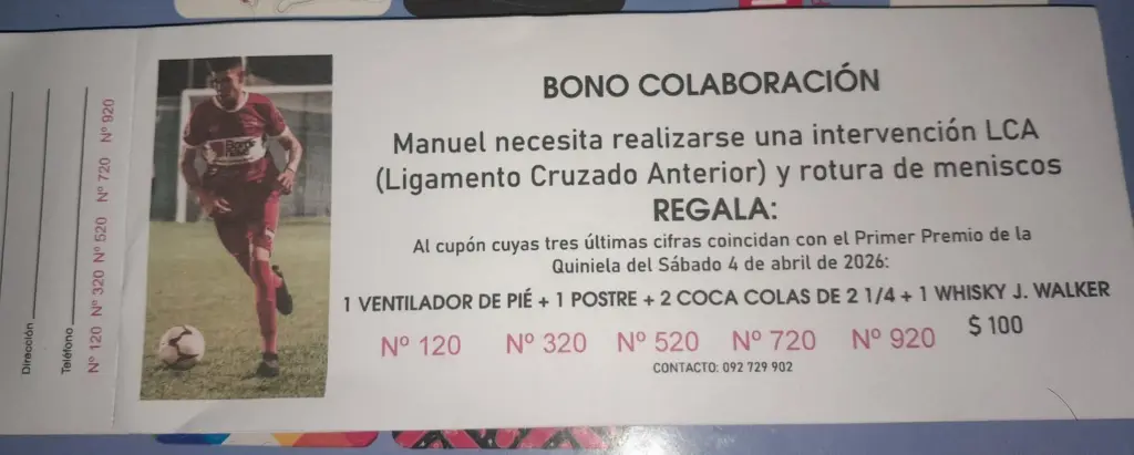 Cuando los jugadores de fútbol padecen también en Salto, este tipo de infortunio: la rotura de ligamentos, etc. Las complicaciones para la operación, porque todo cuesta. Por eso, desde los amigos de Manuel, el que jugó en Parque Solari y en San Eugenio. Los amigos se comunicaron con EL PUEBLO, para revelar el porqué de esta campaña solidaria. Los premios que no faltan y rumbo al 4 de abril. El valor del número es de 100 pesos y el contacto a través del número de celular 092 729 902. Frente a casos como estos, el camino de la solidaridad bien que puede abrirse de par en par.