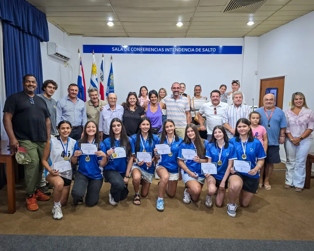 El intendente de Salto, Carlos Albisu, recibió y reconoció al equipo femenino Sub 14 de básquetbol del Liceo Nº 5 de Salto, que representó a Uruguay en los Juegos Sudamericanos Escolares 2025, disputados en diciembre en Asunción, Paraguay.