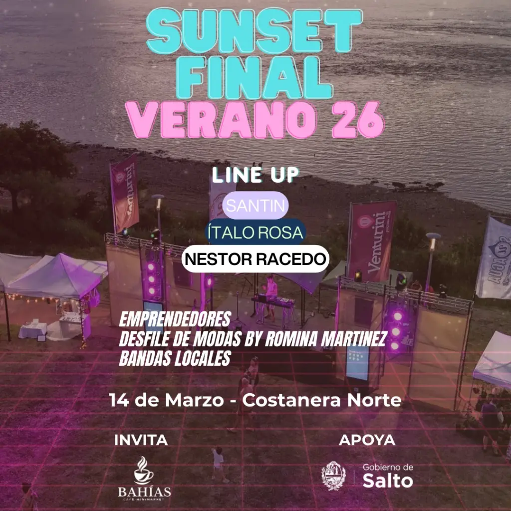 Bahías Café & Minimaket invita a participar del Sunset Final Verano 2026, que tendrá lugar este sábado 14 de marzo a partir de las 18:00 horas. La actividad se desarrollará en Costanera Norte.