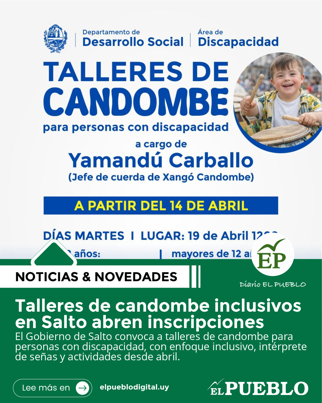 El Gobierno de Salto convoca a talleres de candombe para personas con discapacidad, con enfoque inclusivo, intérprete de señas y actividades desde abril.