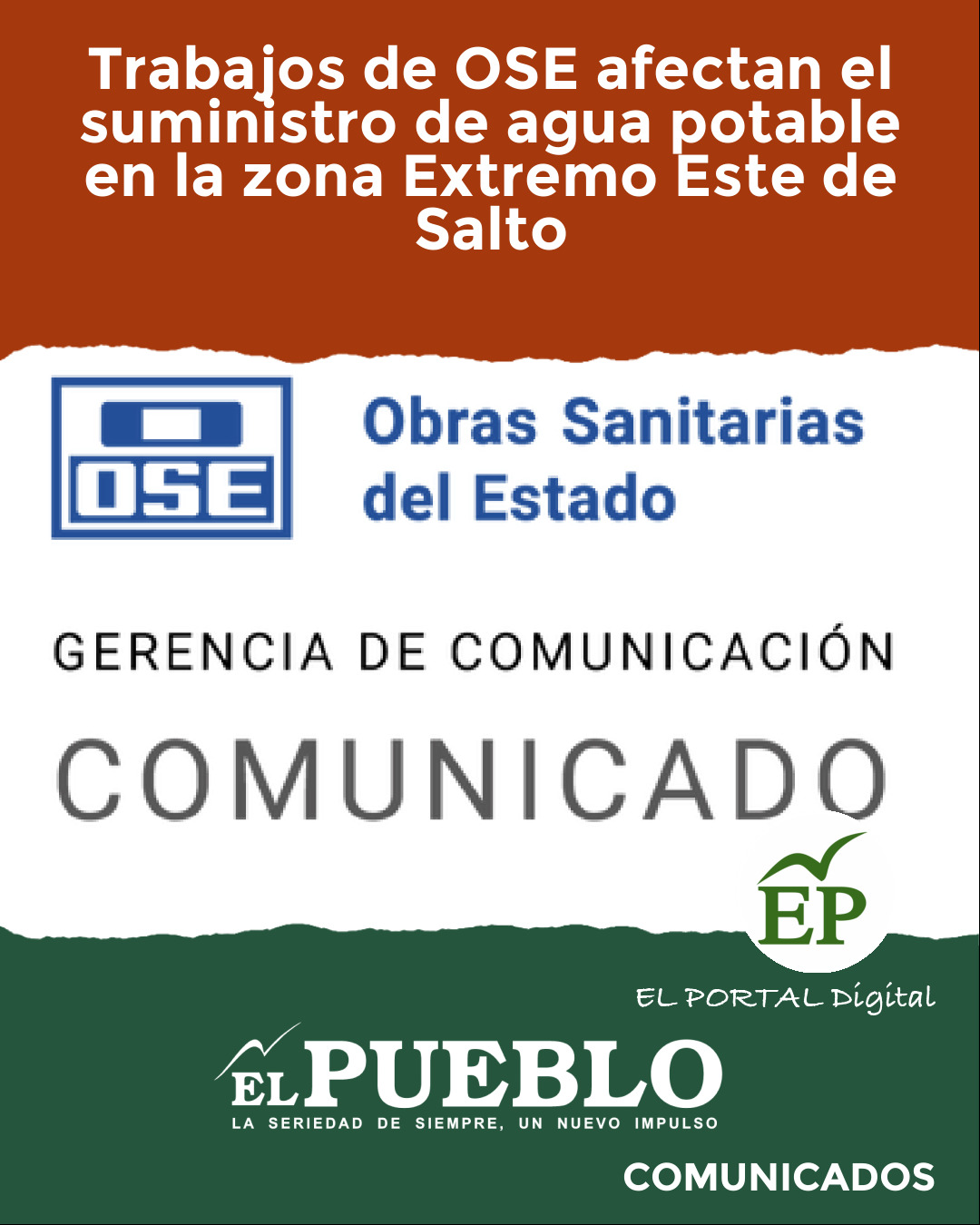 OSE informa que, debido a trabajos programados de reparación en la red de distribución, se verá afectado el normal suministro de agua potable.