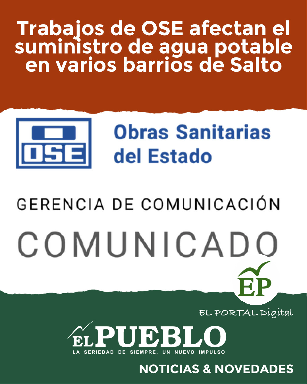 La empresa estatal OSE informó que, debido a trabajos programados en la red de distribución, se encuentra afectado el normal suministro de agua potable en la ciudad de Salto