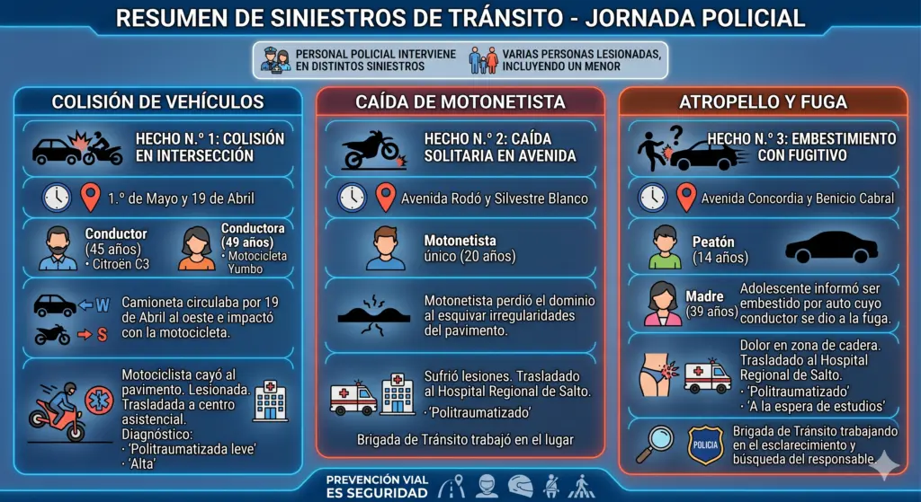 Finalmente, se reportó un siniestro entre un vehículo y un peatón en avenidas Concordia y Benicio Cabral. Una mujer de 39 años informó que su hijo de 14 años arribó al domicilio manifestando haber sido embestido por un automóvil cuyo conductor se dio a la fuga sin prestarle asistencia. El adolescente presentaba dolor en la zona de la cadera, siendo trasladado en ambulancia al Hospital Regional de Salto, donde se le diagnosticó “politraumatizado”, quedando a la espera de estudios complementarios.