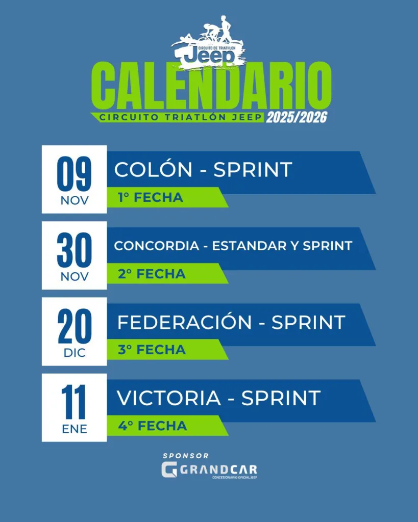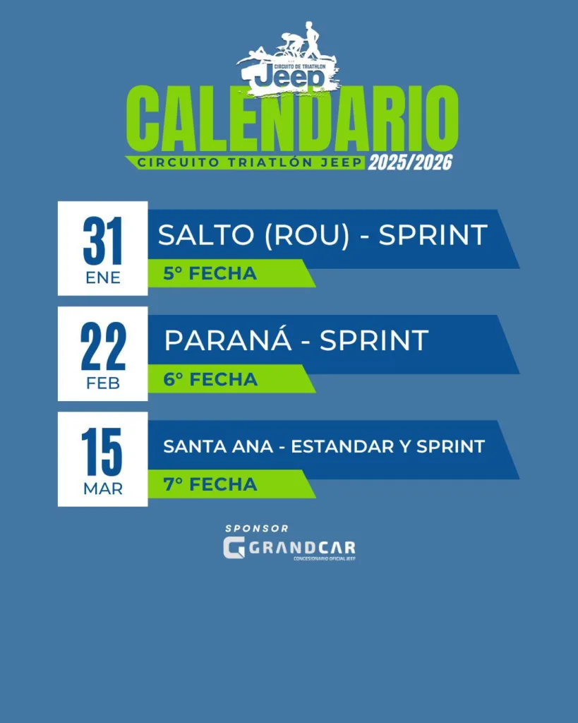 Se detalla en las imágenes las próximas fechas del Torneo Binacional de Triatlón, con las que sólo con 4 eventos se puede participar en la tabla general del Torneo, ya que no es necesario la participación en todas las fechas.