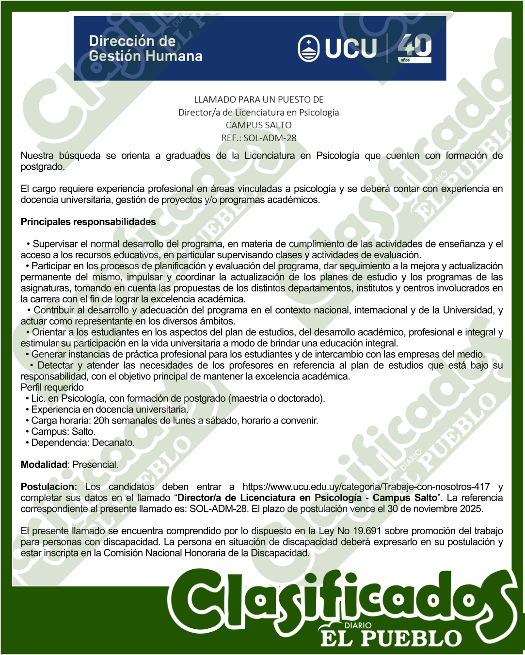 Los candidatos deben entrar a https://www.ucu.edu.uy/categoria/Trabaje-con-nosotros-417 y completar sus datos en el llamado “Director/a de Licenciatura en Psicología – Campus Salto”.