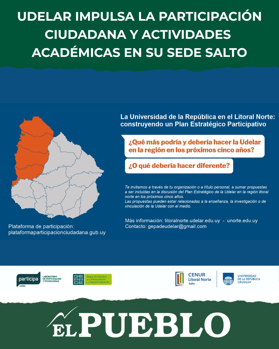 El Centro Universitario Regional (Cenur) Litoral Norte de la Universidad de la República (Udelar) lanzó una convocatoria abierta a organizaciones sociales, instituciones y actores particulares para participar en la elaboración de su Plan Estratégico Quinquenal, mediante una plataforma de participación ciudadana y talleres presenciales en sus sedes de Salto, Artigas, Paysandú y Río Negro.