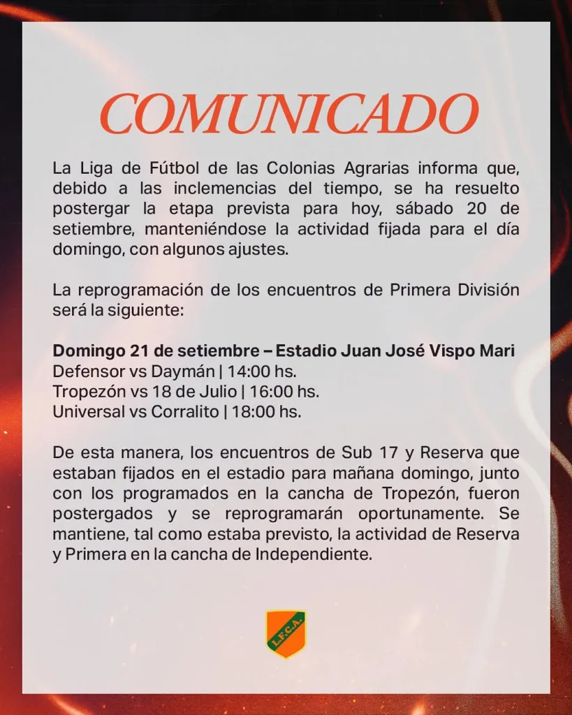 Sobre el mediodía de ayer, cuando la dirigencia de la Liga de las Colonias Agrarias reveló este comunicado, incluyendo lo decidido: suspender el fútbol pactado, pero abriendo la puerta para que hoy domingo pueda jugarse.