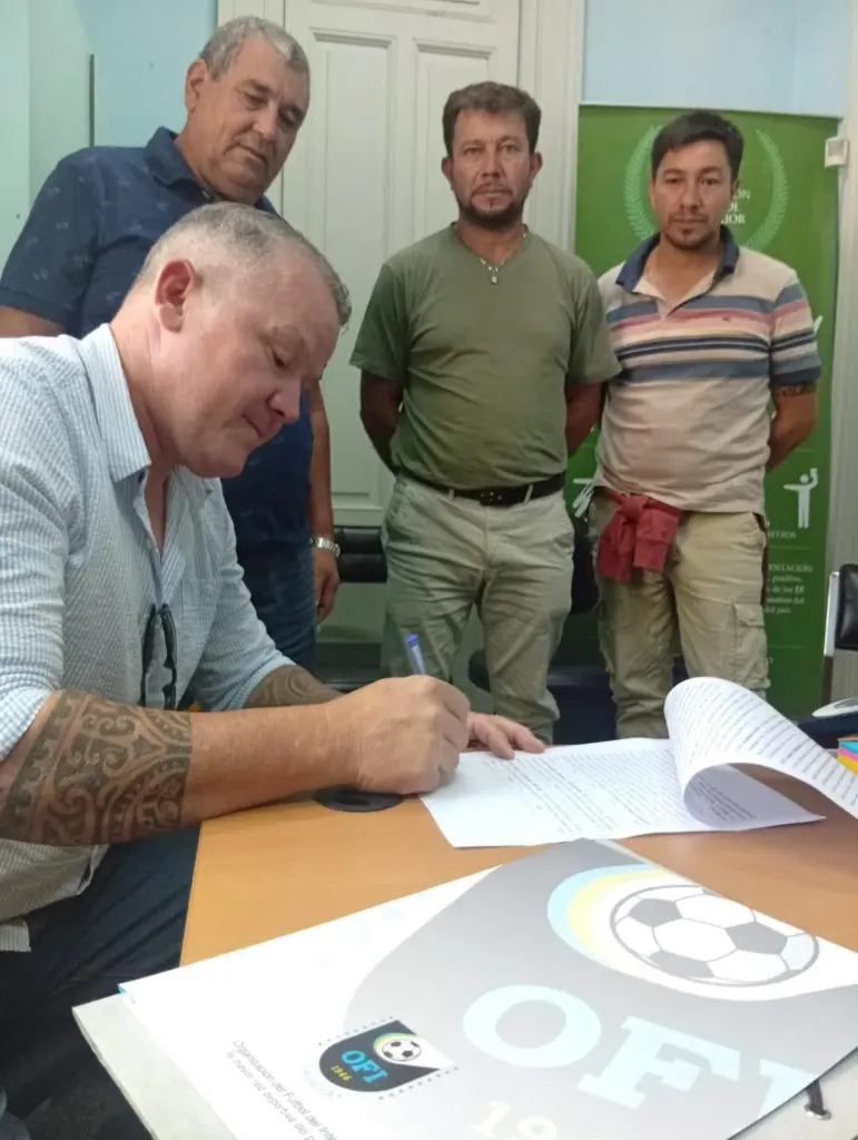 Ahí está el presidente de Gladiador, Álvaro Gómez, a la hora de la firma en las oficinas de la Organización del Fútbol del Interior. En una jornada que quedará grabada en las páginas doradas de la institución, la directiva de Gladiador Fútbol Club ha concretado un avance fundamental para la modernización de la casa propia. Los dirigentes Álvaro Gómez, Abel Rumi, Fabricio Hernández y Edgardo Hernández representaron el sentir de toda una barriada en la capital del país, sellando el acuerdo que transformará la infraestructura deportiva.