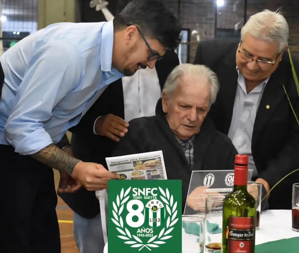 La toma gráfica derivada a EL PUEBLO por Luis Ignacio «Tony» Suetta, porque se relaciona a un tributo especial. Cuando Salto Nuevo celebró los 80 años de vida social y deportiva. La noche de los homenajes y uno de ellos al Dr. LUIS POZZI RIVAS, quien falleciera días pasados. Por eso esta foto, tiene su valor implícito, porque Salto Nuevo no hizo menos que extender la valoración a quien vida supo ser un colaborador incondicional con la causa albiverde. «Tony» Suetta con el entonces presidente Alejandro Moreira y la misión contemplada: que el doctor de la «República» supiera lo que significó en la historia de Salto Nuevo, desde lo deportivo y desde lo humano.