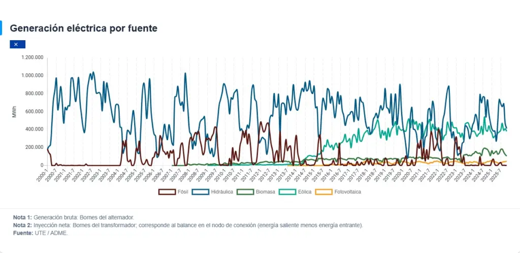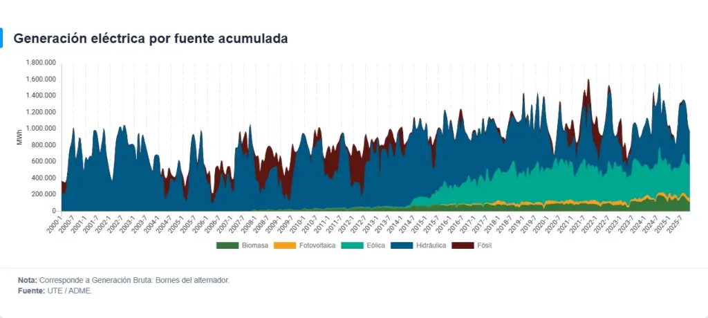 El reporte de la DNE también señala que el 8% de la electricidad generada durante 2025 fue exportada, en su mayoría de origen hidráulico, reafirmando el rol regional de Uruguay como proveedor de energía limpia.