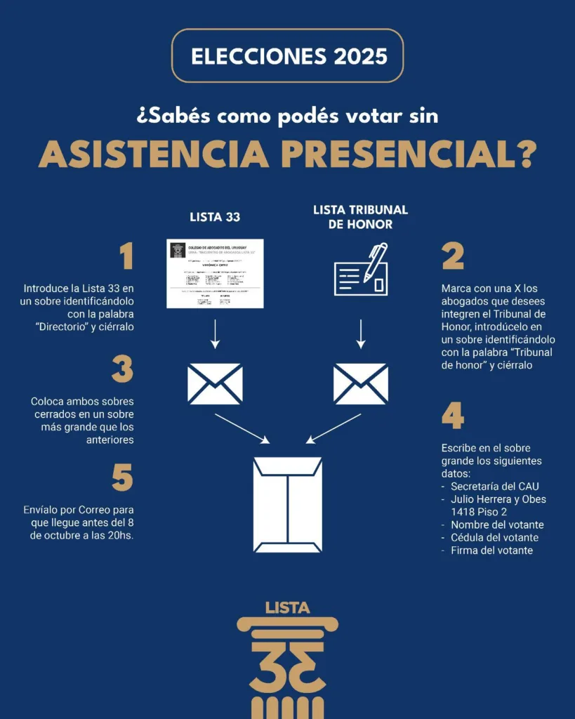 Las elecciones del Colegio de Abogados del Uruguay se realizarán el 8 de octubre de 10 a 19 horas, con voto presencial en la sede de Julio Herrera y Obes 1418 y voto por correspondencia habilitado para todo el país.