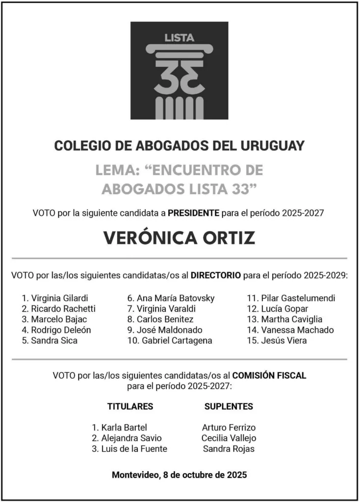 En cuanto a la representación territorial, destacó que la Lista 33 cuenta con abogados de todos los departamentos del país. “Queremos un Colegio realmente federal, que visite el interior, escuche sus realidades y las incorpore a la toma de decisiones. Las condiciones laborales no son las mismas en Montevideo que en el resto del país”, afirmó.