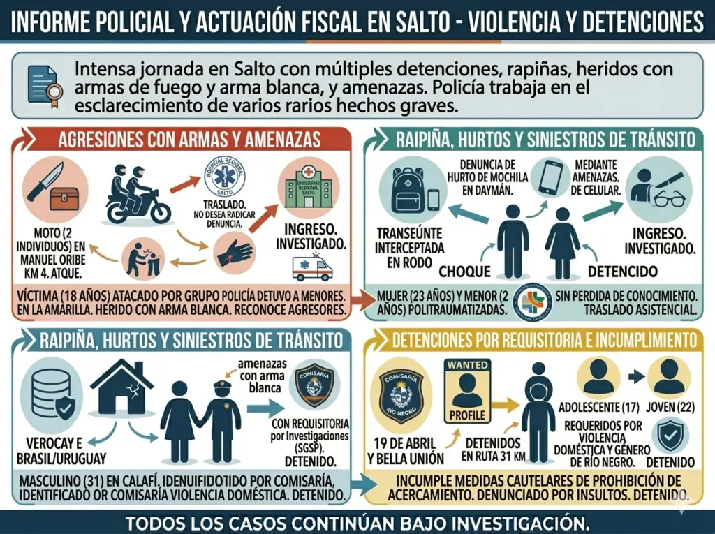 En otro hecho, un joven de 23 años ingresó al Hospital Regional Salto con una herida de arma de fuego en una mano. Declaró que fue atacado por dos individuos que circulaban en moto en Avenida Manuel Oribe, kilómetro 4. Fiscalía fue informada y se investiga el caso.