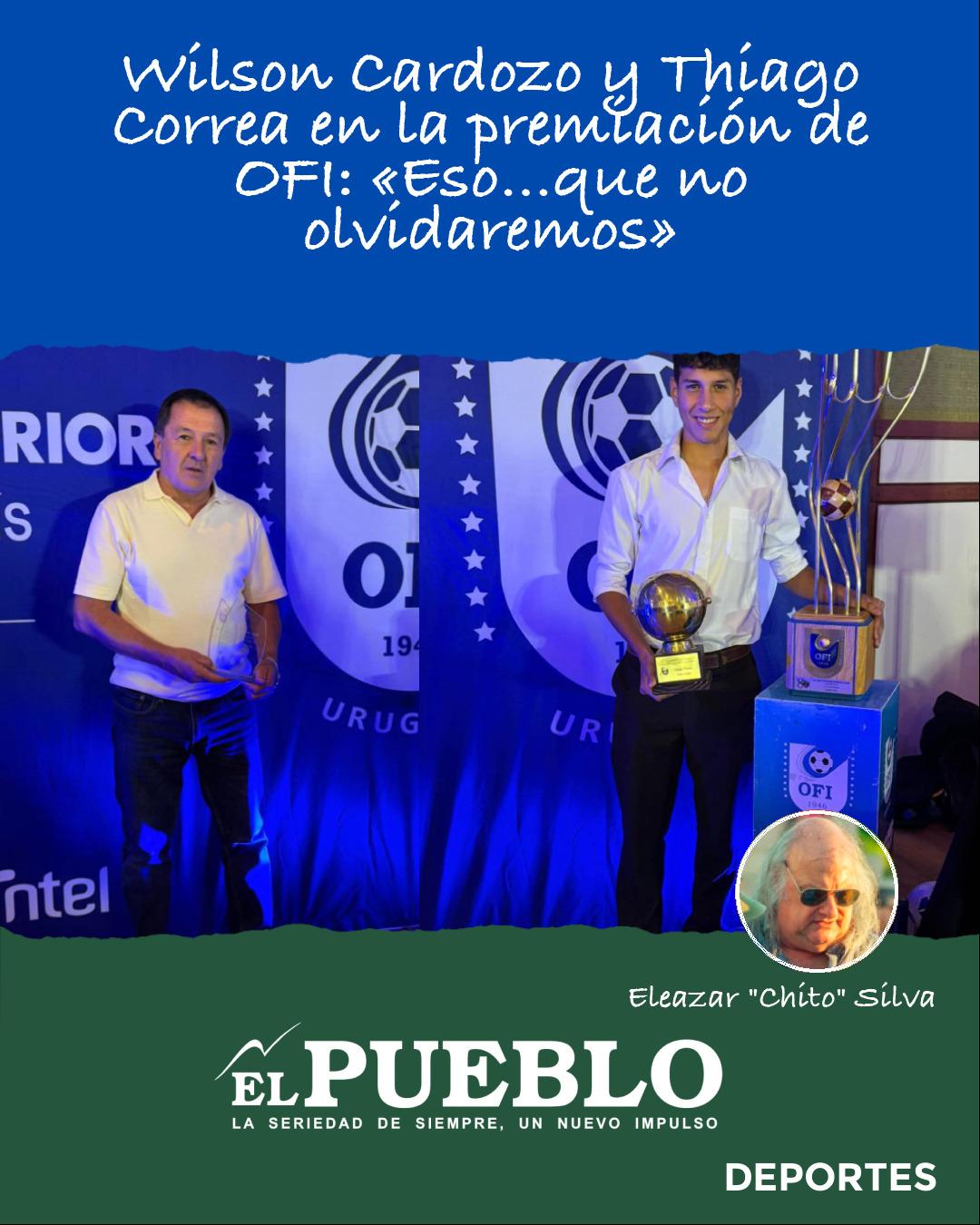 La premiación que impulsó la Organización del Fútbol del Interior, se transformó en una de las aristas salientes en la semana que pasó. Ocurre que para los salteños, las distinciones no faltaron, desde el momento que WILSON CARDOZO fue nominado como EL MEJOR DIRECTOR TÉCNICO a nivel de la categoría Sub 18, mientras que THIAGO CORREA se constituyó en EL MEJOR JUGADOR de la categoría. Trofeos para los dos «naranjeros» y la coincidencia que les fue común, porque «es eso…que no olvidaremos», haciendo alusión la copa levantada de campeón. Para Thiago ese torneo se convirtió en notable vidriera, desde el momento que surgiría su pase a River Plate de Montevideo. En el caso de Wilson, se reafirma su liderazgo en el mando técnico de la Sub 18. Las tomas gráficas derivadas a EL PUEBLO, reflejan ese tiempo que sucedió. Al fin de cuentas, hará a la emoción infinita. Raza de campeones.